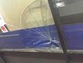 I guess what happened, and this is his version as I didn't see it. He had his handtruck near the exit of the trailer. He was putting the empty crates away, when he spied that the handtruck was moving. He turned and he saw it all in slow motion, it kept rolling and he grabbed for it only to see it fall out of his trailer and slammed into our window, causing it to get a large hole and shards of glass nearly sticking out like a rare flower. He called his boss. I attempted to call my boss. He called another person, i wrote out a report. Showed boss when he got there, he told area manager who wanted to talk to me, and even asked if the driver asked me not to tell anyone. I told her no, and if he did then I would laugh and knew he be lying then. I also told her I knew him since I was at my first store, and she seemed fine by that. So after that, I don't know. The delevery guy said Coke insurince will pay for it.