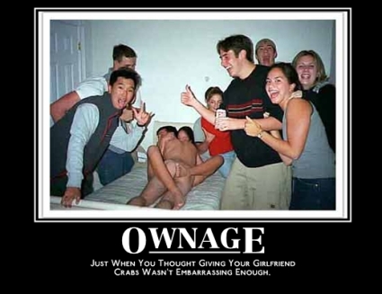 I'd post my favorite ones, but I have a feeling my warning level would hit like 380% or something ridiculously high. Just go to ebaumsworld and look at their demotivational posters. If it's perverted, I probably like it. For example, find the first set of demotivational posters on ebaumsworld, and look at numbers 1, 7, 13, 23, 28...you get the idea.