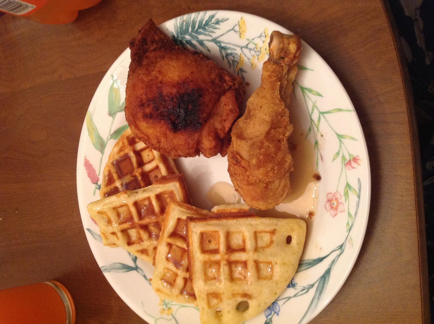 Then I saw Cookie post on facebook that she'd just gotten a new waffle iron and inspiration struck. CHICKEN AND WAFFLES!!!