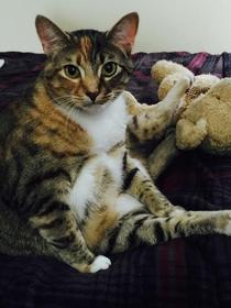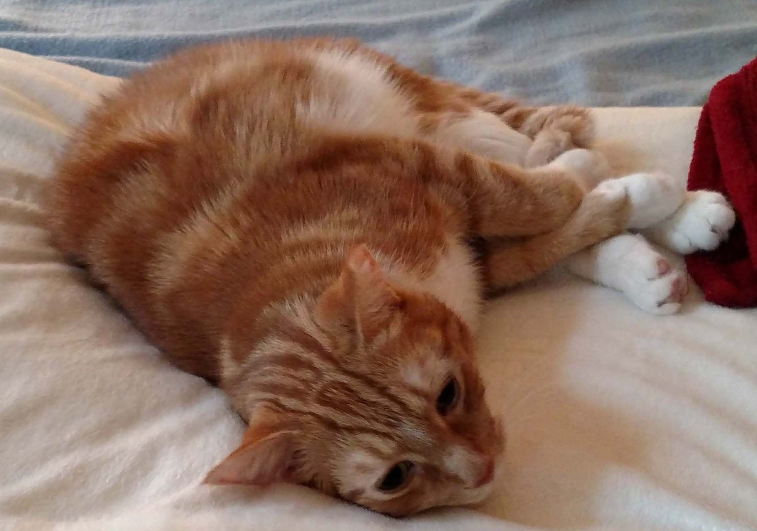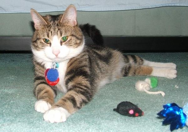 Here are my two, Mister Kitteh (getting scritches as a bribe so I could get a pic of him) and Little Bittle Kittle, my feral (and I suspect brain damaged) little girl cat.