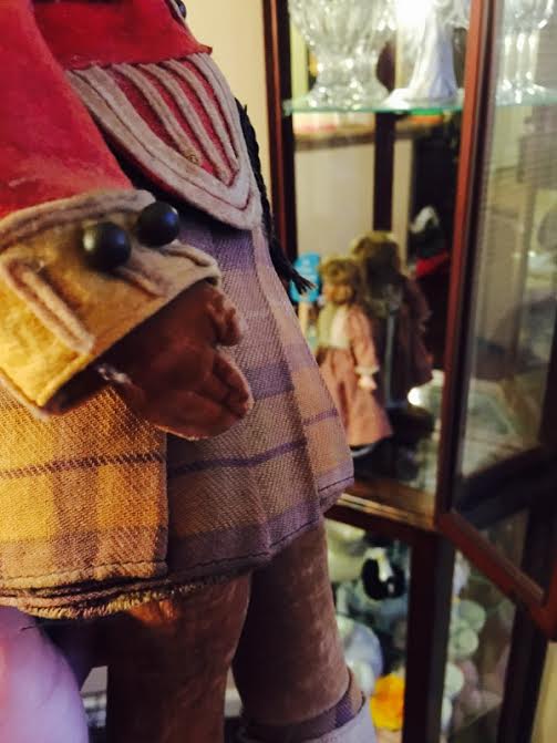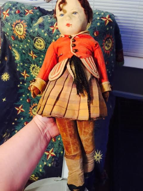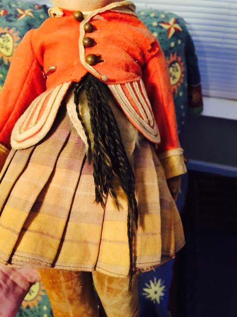 My mother gave me this doll, which she had been given by her great uncle back in the late 40s or early 50s. He had traveled to the UK, and bought this doll there, and apparently told her that he was an English guardsman, which is what I believed for years. After mom gave me the doll, I realized that he's wearing a kilt, and appears to be Scottish rather than English, and seems to be made of felt. That's all I know about this doll, and hoping that someone somewhere has seen a doll like this, and knows what he would have looked like in pristine condition. I'd like to know this so that I can possibly get him restored.