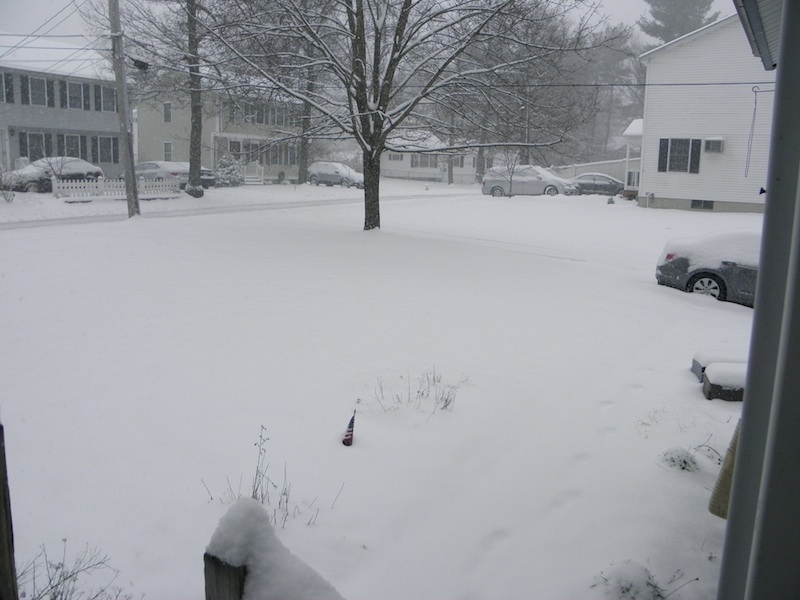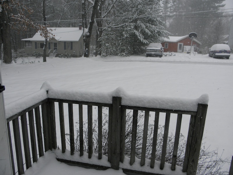 For us, as Irv mentioned above, the weather craziness as of late has been snow. Got about four inches of the stuff this past Monday (after having already gotten a couple of inches the day before), and I actually ended up revving up the snowblower to clear the driveway (mainly to burn off some of the gas in the tank). Here are two views from outside our front door while the storm was still ongoing: