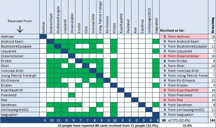 Please let us know what cards you've received if you haven't been. Also just because tomorrow is Christmas doesn't mean you should stop. I'm assuming all that white space is in the mail.....