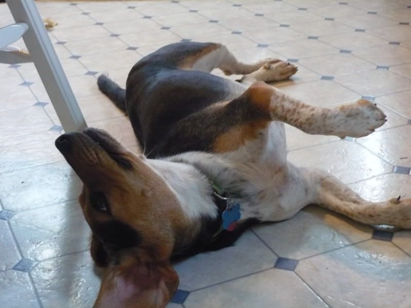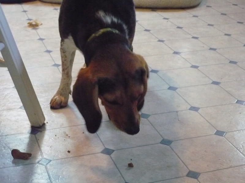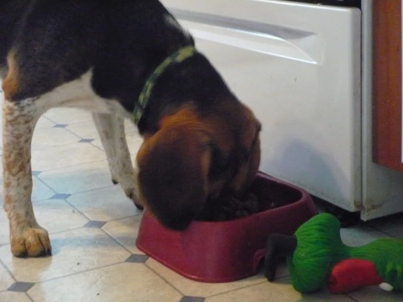 Special Dinner of canned dog food mixed with her regular kibble. She didn't even come up for air.
