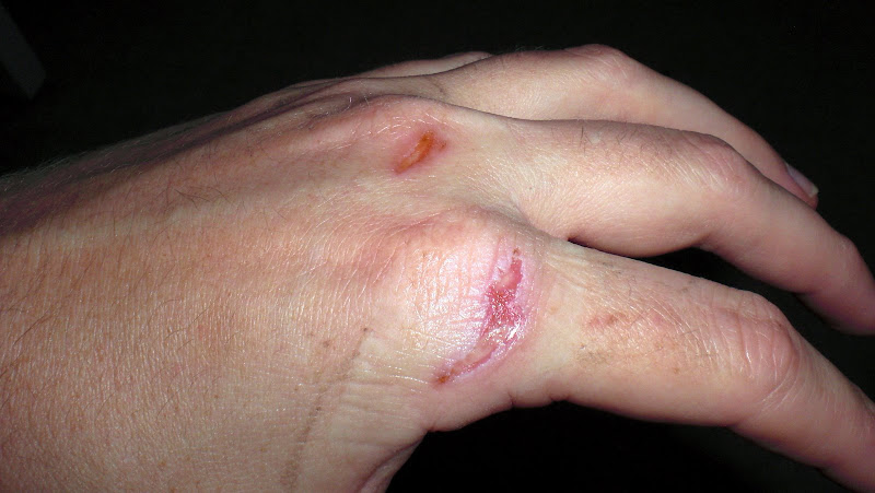 My brother and I had cleaned the gutters before pressure washing. The idiots who installed them before we moved in put the gutters INSIDE the pool screen (yeah, I know...it doesn't make any sense), so we had quite the mess on our hands. As I was hosing down the walls to get all the gutter yuck off of them, the spray hit the pool brush pole, and I instinctively grabbed it so I wouldn't get clocked in the head. I didn't, but my hand did get in the way of the pressure spray.