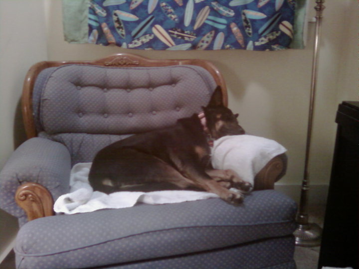 so my brother got a promotion and had to move to chicago. unfortunately, he couldn't take his dog with him. so we're taking care of her! and by "we" i mean since i'm living at my parents house for now...yeah. but she's sleeping up in my room and i'm pretty much responsible for feeding/walking/ect. my dad's not too keen on having another pet so the theory is that if we can find her a good local home, she'll go there. but i really hope i get to keep her.