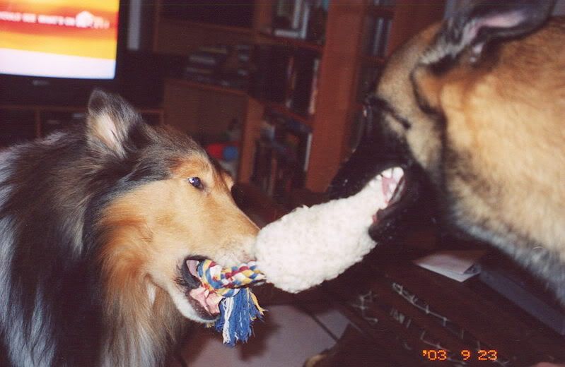 At least he's playing with his two best canine friends, Mango and Lakota.