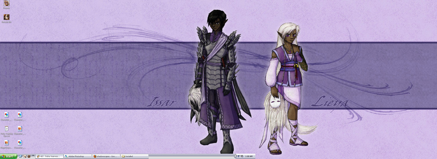 • My current desktop (Doctor Who owls by pu-sama on Deviantart), and what it replaced a few months ago (my own art). Super-wide because I have a widescreen monitor and a regular monitor in a dual desktop setup, and I prefer to have a single wallpaper that stretches across both.
