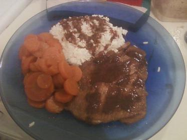 Paper thin pork cuts marinaded in Worcestershire sauce, garlic and onion for about three hours then cooked in the pan with the marinade. Brown sugar glazed carrots and rice. The sauce is the marinade from the pan. To drink? Black Jack Coke. I am pleased. Very very pleased
