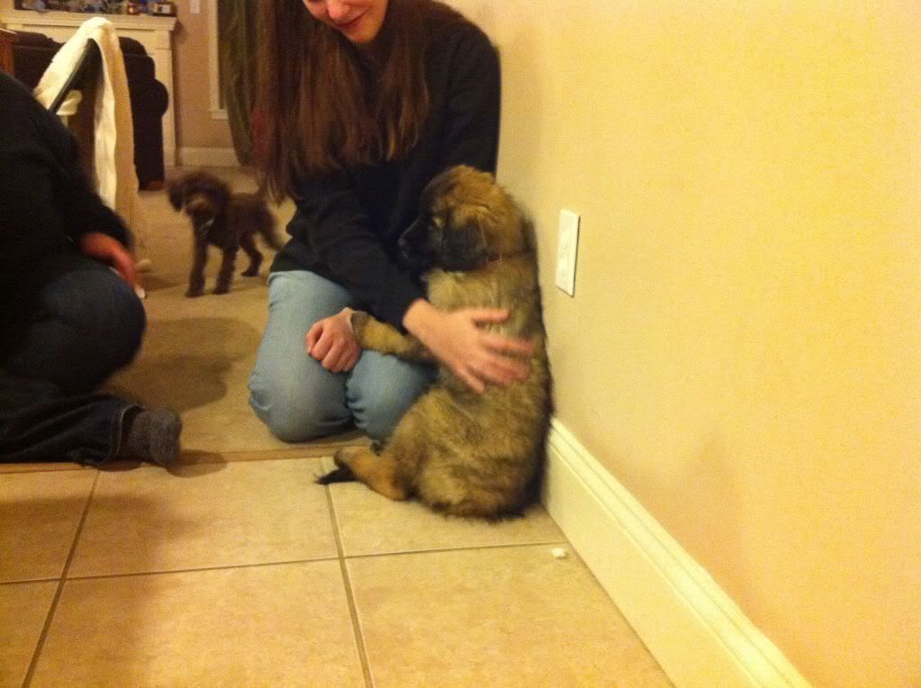 DH and I drove up to Chicago yesterday and picked up our puppy! At 9 weeks old, she weighs about 20 pounds, and is incredibly fuzzy. She got to go to lots of places yesterday. We went from the breeder's to Petsmart and picked up a car harness for the trip home. Then we made the 3 hour drive, stopping once for a potty/food break. When we reached Peoria, we stopped at this cool shop called "My Dog's Bakery" to buy antlers for chewing and some treats. After that, we stopped by my friend's house, where Ceileighe (pronounced Kaylee) met a puppy twice her age and half her size, and made tentative friends. From there we went to an SCA fighting practice, meeting lots of new people, hearing new sounds, and getting her nails trimmed. When she started to wear out again, we took off to visit DH's parents, eat dinner, and head home. Ceileighe really likes her grandpa!