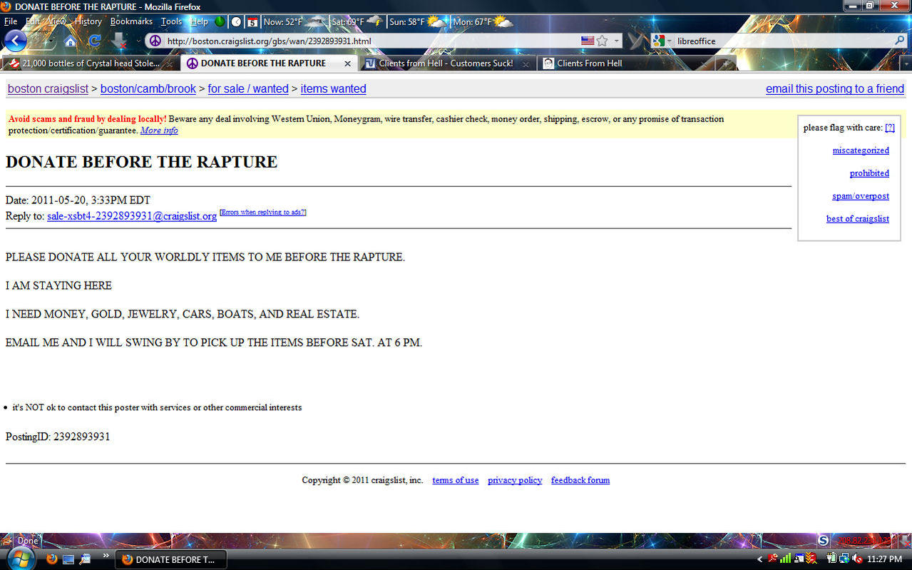 On a related note....Any rich folks out there reading this who believe Mr Camping, would you please send me your address and leave your front door unlocked? Thank you kindly.