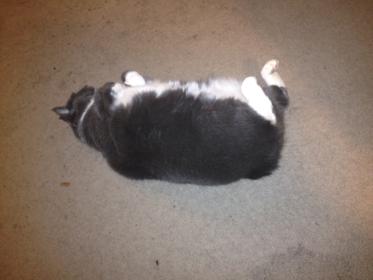 My little, round, and fuzzy cat taking a nap - and doing her impression of someone hit by a truck.