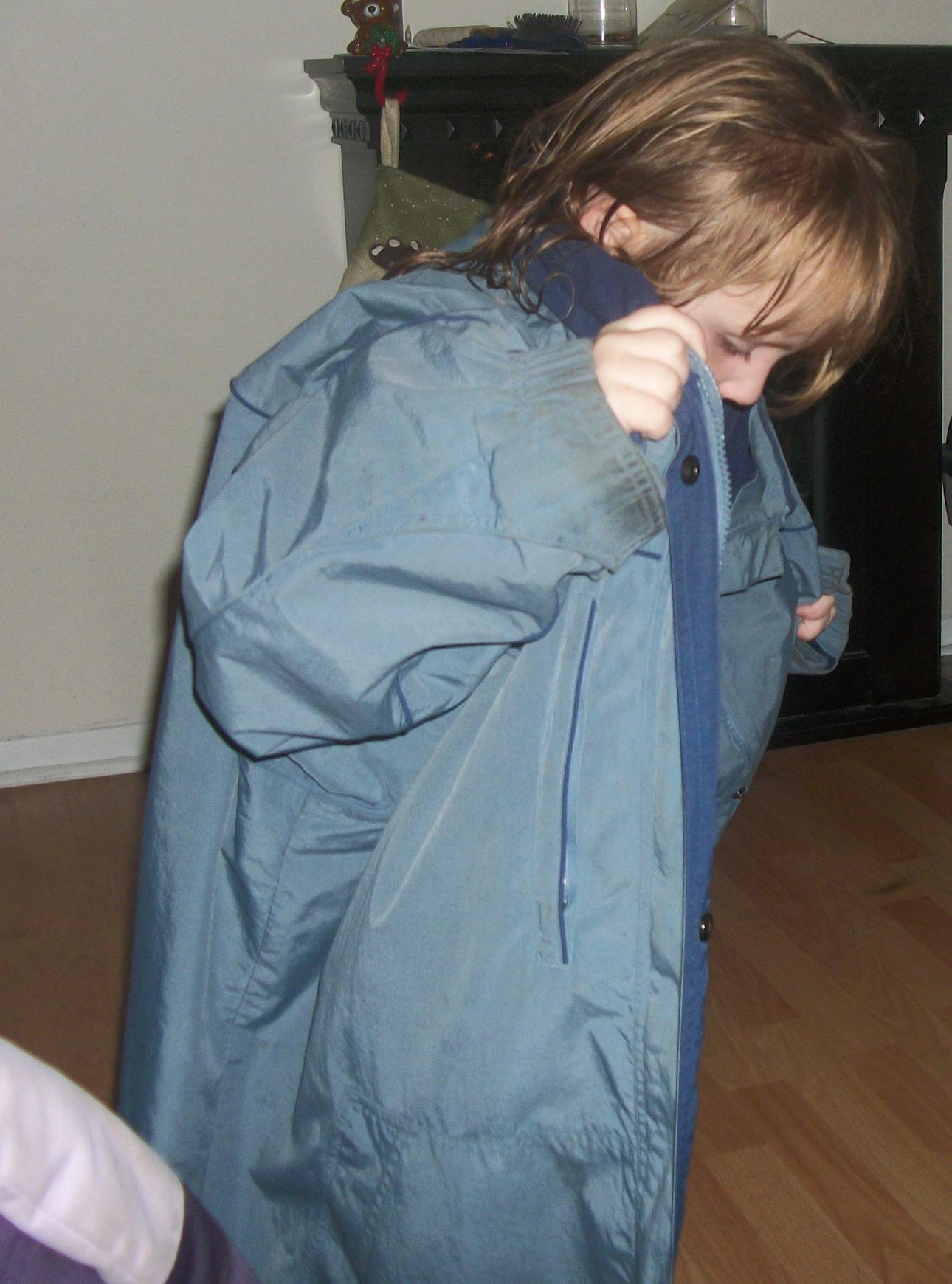 She put on my coat tonight, which, of course, was umpteen sizes too big, and was running around saying, "I'm a customer! I'm a customer!"