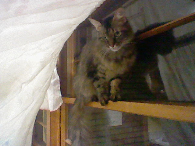 there is another cat here, a big fat mean cat that doesn't bully her physically but does give her stare downs and sits close to her being menacing as if being that shadow that always hovers over her. they USED to play and get along mostly. something changed that she now hangs out in the windows of the house to the point she falls down because she won't come down beyond to eat and use her litterbox. she tries sleeping up there and because of that falls and loses her balance.