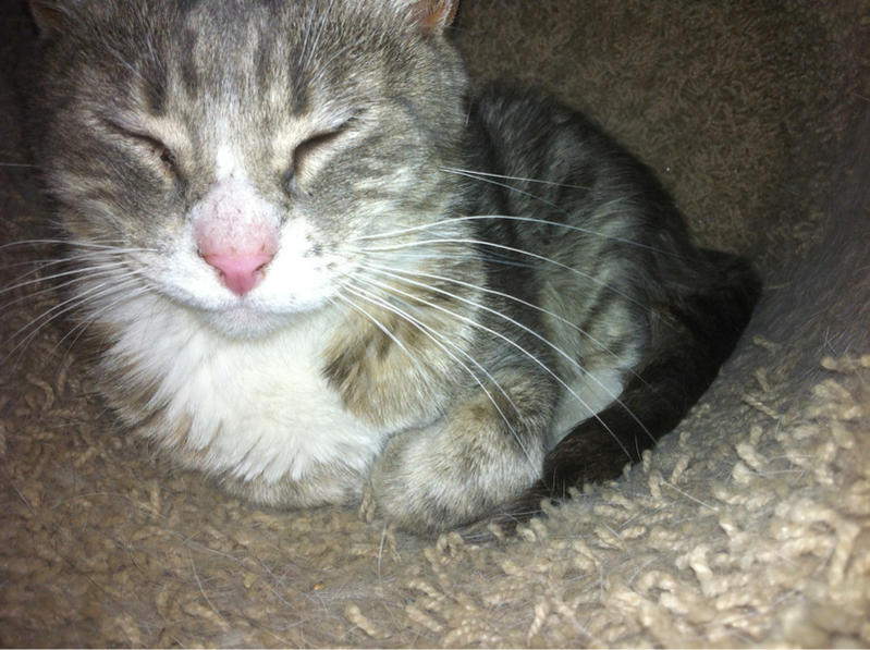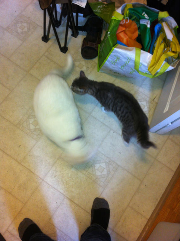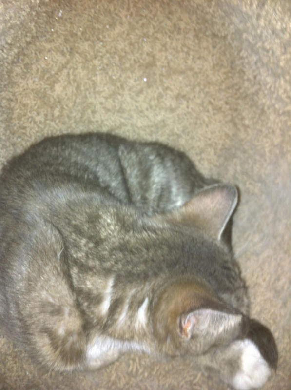 My kitty Loki went out for a little while this morning and brought me a new friend when he came in. She's a sweet little kitty, I'd say about 6-8 months old, very friendly so been around humans. No tag, of course. Called the town office, no ones reported her missing, called the humane society, no missing reports to them. I left a description and my information with them but not holding out much hope. She's at the right age to be spayed, so I think someone dumped her because they didn't want to pay. She's been hanging around the neighborhood for a few days now and is starting to get the scruffy fur of cat who's been outside for awhile.