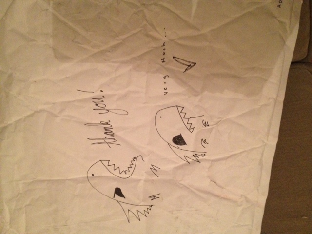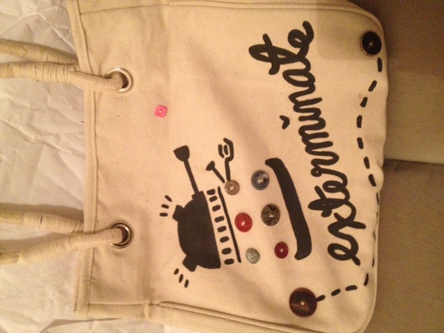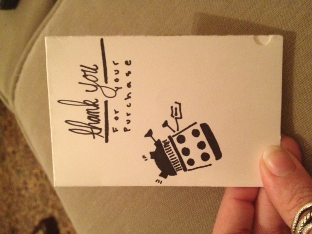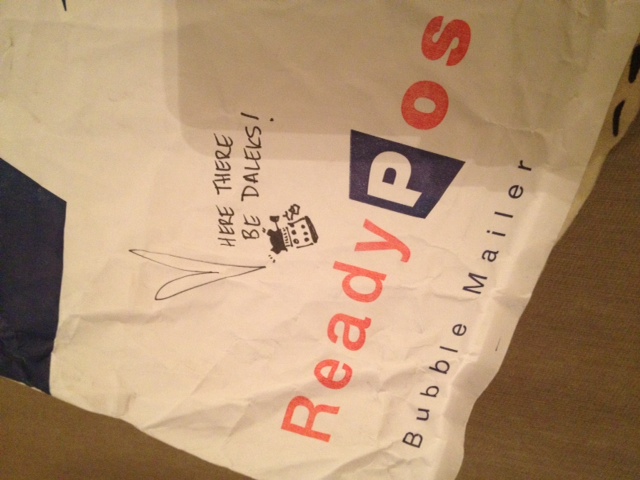 THE CUTSEY DALEK BAG! (please note the adorable messages strewn across the packaging, it really shows what an attentive artist she is. I can't say enough about how great this woman has been, even if it was twice her original estimate.) It's over a foot square, with rope handles and a ton of space inside. I expect to be able to use this bag for a very long time, and in many different contexts.