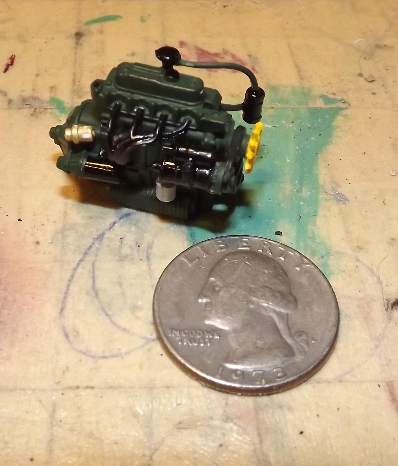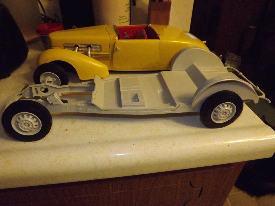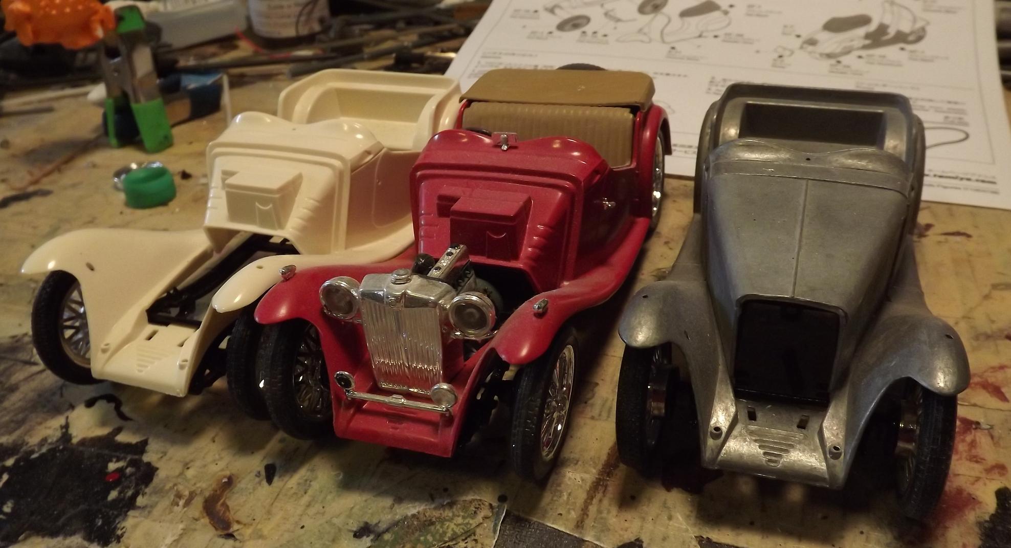 AMT has had some real dogs over the years. Mainly, because several of their kits have been around since the Earth cooled, and the molds are wearing out. Some of their newer kits, are quite good--the '57 Chrysler 300C, '58 Edsel Pacer, '58 Plymouth, etc. because those were all-new items. That's not to say that some of the older items can't be made presentable, but it takes work. Here are a couple of mine--a pair of 1/12 scale 1937 Cords, and a 1/25 American-LaFrance fire truck chassis. Other items on the workbench, are this lovely trio of 1/24 Monogram/Revell MG TCs, and the 998cc four-cylinder out of Revell's new 1/25 scale Mini kit.