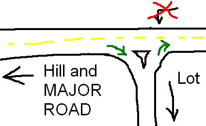 I live right next to a busy street, which crosses my not-so-busy street at a big intersection, kind of like this: _|_ (the bottom line would be the busy street). This busy street is old so is only 4 lanes wide. There are no left turns allowed onto my street for two reasons: