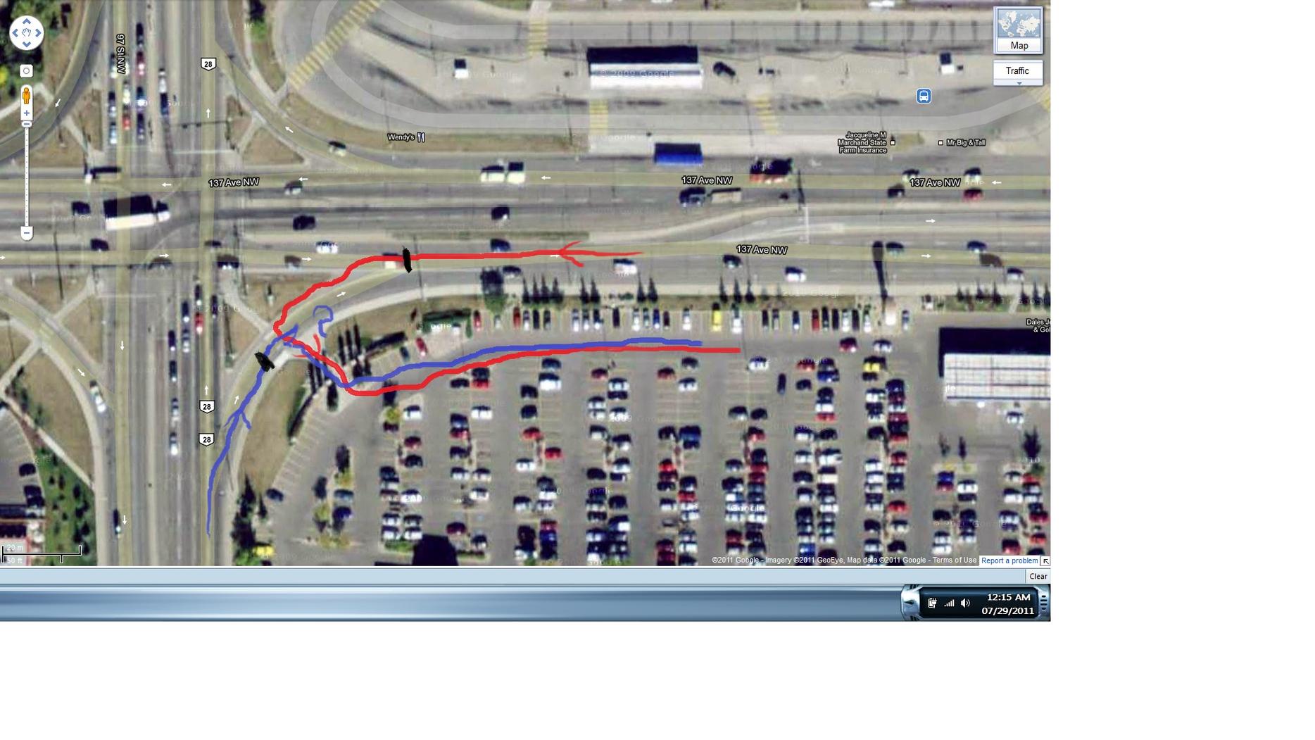And yes, the arrows are drawn correctly. Despite the concrete median seperating the two directions of traffic, she was driving her sedan down the wrong side of the road, towards me. In my big truck. Where I can run her over. However, I'm taking the corner slow so I'm able to stop in time.